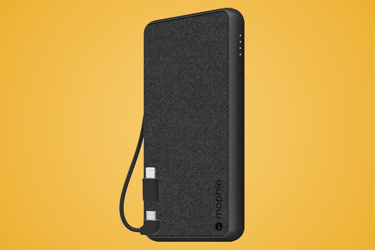 The Mophie Powerstation Plus XL contains an integrated micro USB to lightning cable for charging iPhones. The tip stores inside the power bank when not in use. It also features a USB-C and USB-A port.